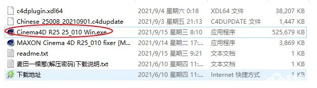 1、在卖葱软件园下载压缩包后,解压到本地,得到C4D R25破解版安装程序和破解补丁文件;