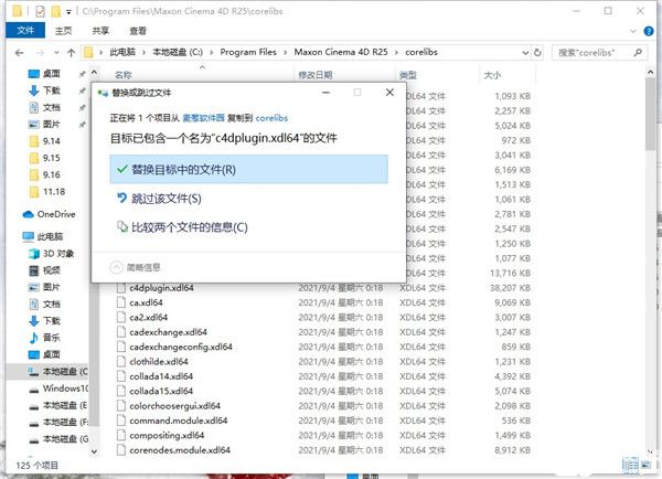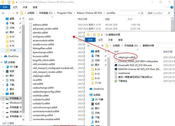 8、将c4dplugin.xdl64破解文件,复制到软件安装目录:C:Program FilesMaxon Cinema 4D R25corelibs;
