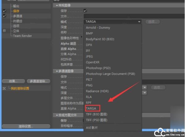 3、再从界面上方的渲染设置里,找到保存,在常规图像里,将图片的格式转化为TARGA。