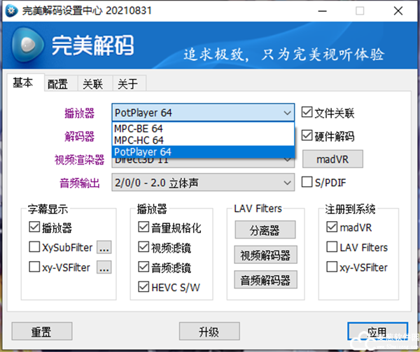 完美解码的播放质量是PotPlayer所无法比拟的。软件本身自带MPC-BE、MPC-HC播放器、高画质渲染器madVR,对于超高画质的电影、纪录片等都可以做到完美呈现。
