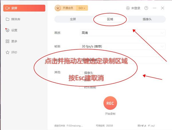 5、回到主界面,点击区域后,可以框选一个区域进行录制。