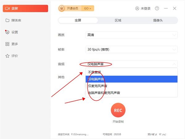 8、对于音频来说,可以静音也可以只录制电脑的声音或者是麦克风声音。
