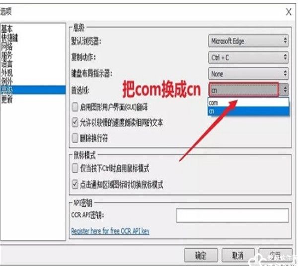 5、在弹出的窗口中找到高级设置,将首选项设置中的com改成cn,之后点击确认保存退出;