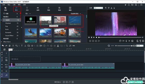 切换到“音乐”面板。电影中应该有音乐。您可以双击以预览目标音乐。将音乐拖放到时间轴的音频轨道。它将添加到时间线。