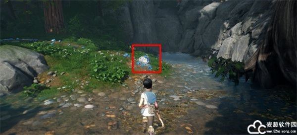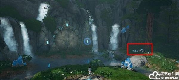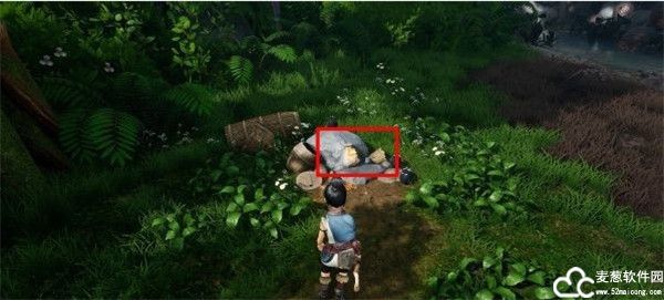 2、来到了桥的另一边后,再一堆石头的旁边有一个背包可以拾取。