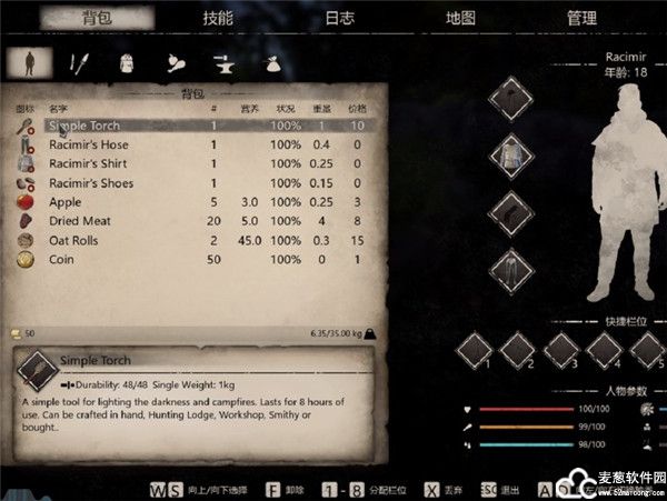 3、在背包中可以装备你的工具和武器,还能随时查看自身的健康状态,记住要时刻保持在一个健康的身体;