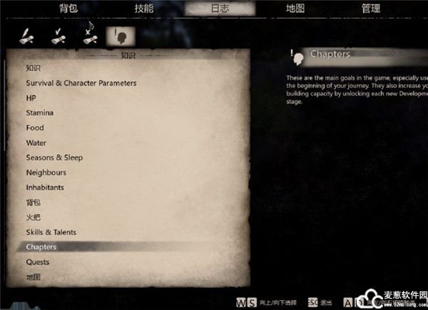 2、进入游戏之后按下esc键可以查看日志,日志中有你最近解锁的成就以及学会的知识和技巧;
