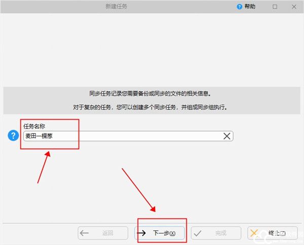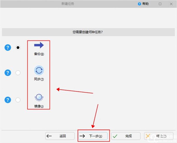 3、选择你要创建的任务类型,有备份、同步、镜像三种类型可选,点击下一步;