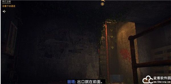7、这里的下水道没有任何的分岔路口,你直接按照记忆中的路线前进,来到了一个红色的楼梯前,这里也是下水道的出口所在,你爬了上去;