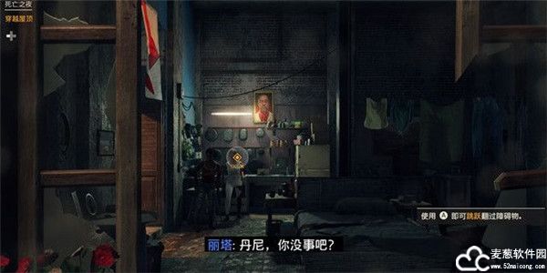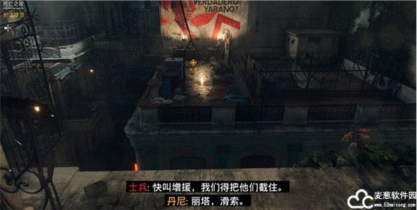 8、出来之后你来到一个废弃的建筑旁,你想要观察以下你的周围是一个什么样的情况,最后你决定爬上屋顶看看,因为你知道屋顶和屋顶之间是有绳索可以滑翔的,这有利于你的转移和逃跑;