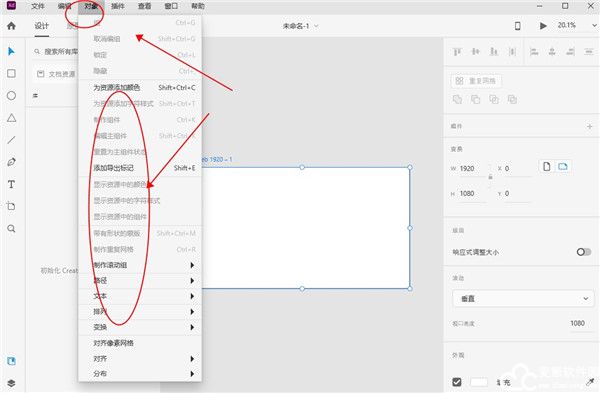 5、在对象中可以为资源添加颜色或者是制作滚动组,还有文本、排列以及变换等工具。