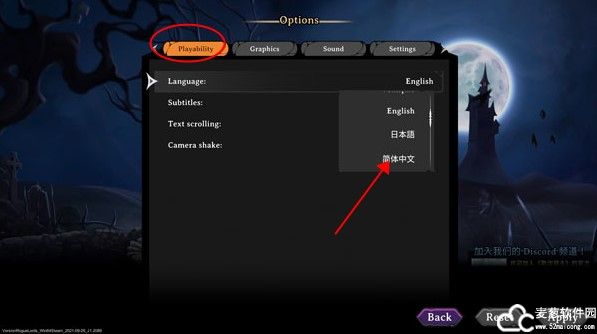 3、进入游戏后,由于初始界面为英文,我们点击options,然后在找到language中,找到简体中文即可;