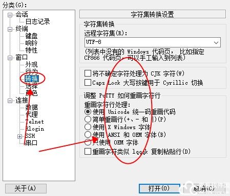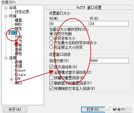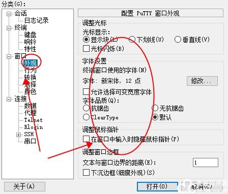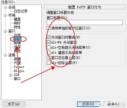 8、配置PuTTY的窗口行为,可以调整窗口的标题外观或者是使用单独的客户区窗口。