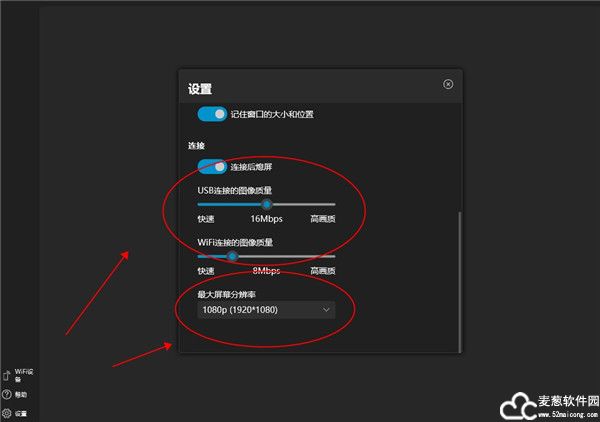 6、在右下角的设置中,可以设置最大屏幕的分辨率以及USB连接的图像质量。