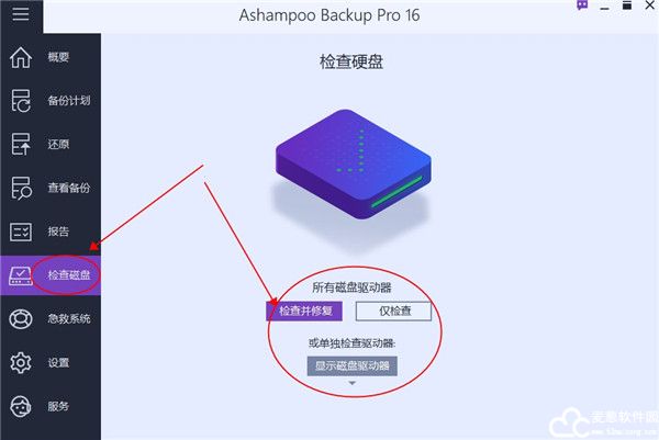 备份中可监视硬盘 SMART 参数,自带检查和修复驱动器 / 分区功能。