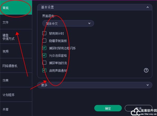 1、在基础设置中,可以修改软件的语言,并且还能隐藏录制面板以及启用声音通知等。