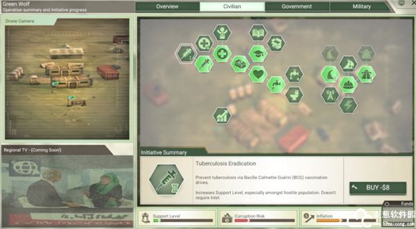 前期和中期一边平叛一边补充几块钱的服务型民生政策,尽快扩大绿区范围,中期开始发展政策,基础设施交给慈善组织。