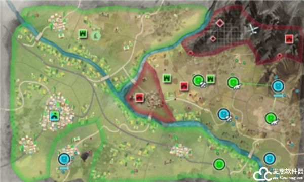 不要想着全歼敌人,因为灭掉一个新的很快就会再次出现,所以要把敌人逼到山区,养起来,最重要的是一定要把两个区域留给敌人,如果只留下一个,很有可能在地图上随机生成新的敌人。蓝棋负责打架,绿棋负责围堵,后期互换。