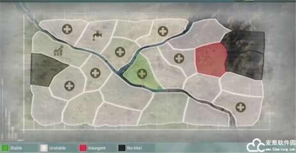 左下沙漠:5个偏远的沙漠地区和1个小路村庄,值得注意的是,它被只有三个有道路直接连通的格子包围着,很容易遏制其中的叛军。