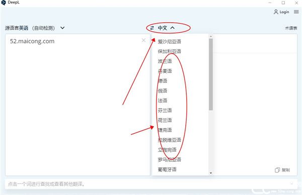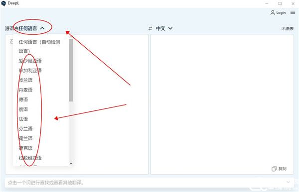 1、打开刚刚安装完成的软件,找到左边的源语言,点击小箭头下拉,选择需要的语言。