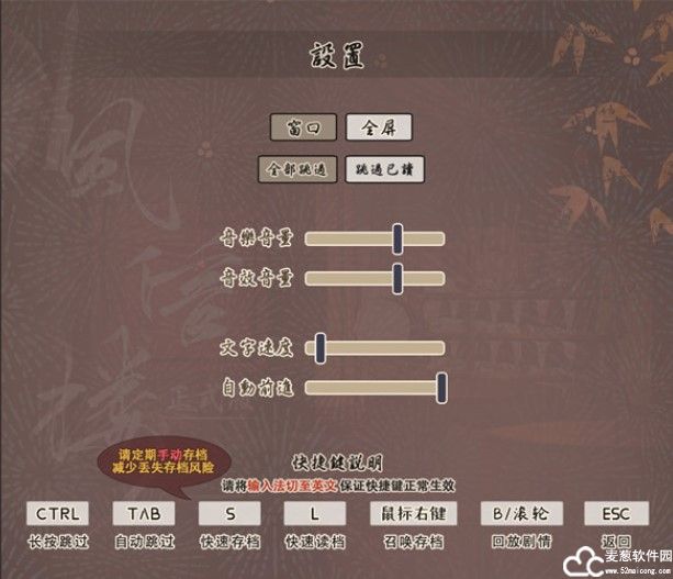 4、每个玩家的操作习惯不同,你可以设置窗口、音乐音量、文字速度以及自动前进等。