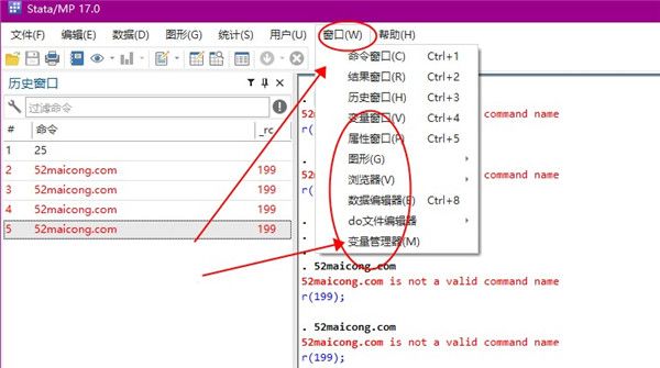 7、对于窗口来说,可以设置命令、结果、历史以及变量窗口,并且还能够启动变量管理器。