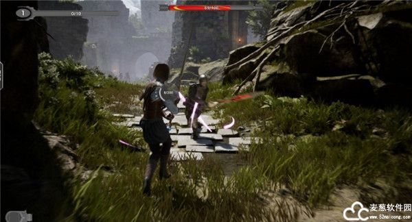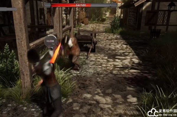 2、玩家可以点击鼠标进行挥砍,如果命中了敌人会造成伤害,并且在上面有血条。