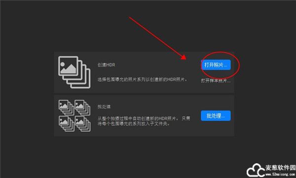 1、打开软件后,首先会弹出一个创建HDR的选项窗口。点击打开照片。