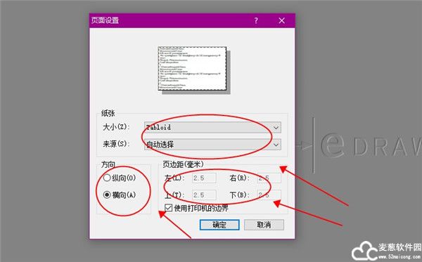 2、之后就会弹出页面设置的窗口,再里面可以设置纸张的大小以及方向和页边距。