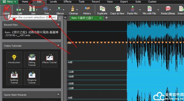 8、如果有不需要的,可以点击Edit选项中的Delete删除按钮来清除选取的片段。