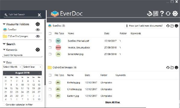 软件以清晰的方式管理所有重要的文档和格式:PDF、DOC、Docx、XLS、xlsx、RTF、ODT、GIF、PNG、JPG、JPEG和BMP。