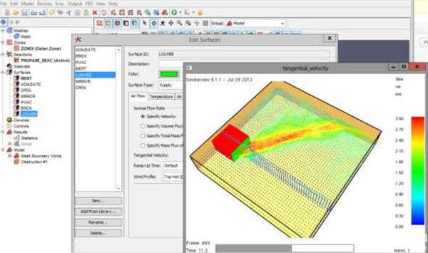 软件允许您交互查看和修改与模型中所有对象相关的属性。这种视觉反馈可以加速模型的创建,减少错误。在PyroSim 2021破解版,我们可以看到一个包含切向速度的表面来模拟通风孔。