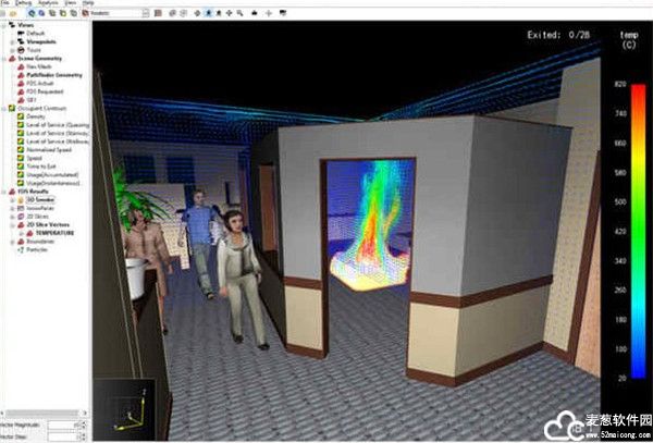 检查烟雾、温度、速度、毒性和FDS分析的其他输出。通过调整相机和数据可视化,实时创建视频,或者通过模型设置准备好的视觉导航。它可以在NIST提供的Smokeview之间轻松切换,也可以使用与PyroSim 2021破解版界面相似的Resultswer,该界面还可集成Pathfinder乘员的移动结果。