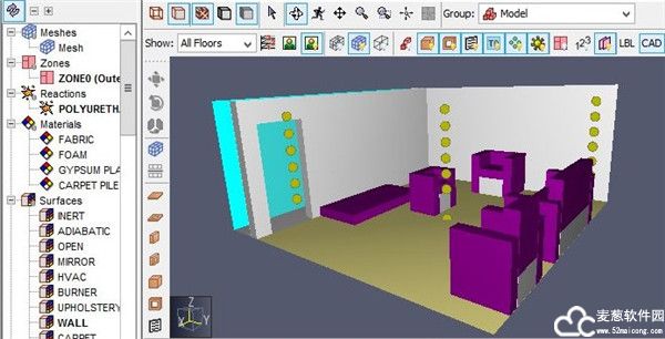 软件提供了一套完整的绘图工具,可以让你快速创建模型。这些工具包括支持所有FDS对象、复制和粘贴功能以及将纹理附着在表面。