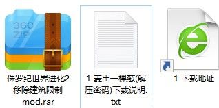 1、在麦葱站下载侏罗纪世界进化2移除建筑限制mod压缩包并解压文件。