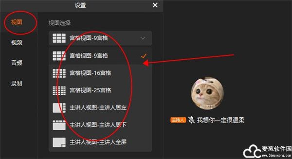 4、在设置中可以调整视图的格式,就比如宫格、主讲人视图等。