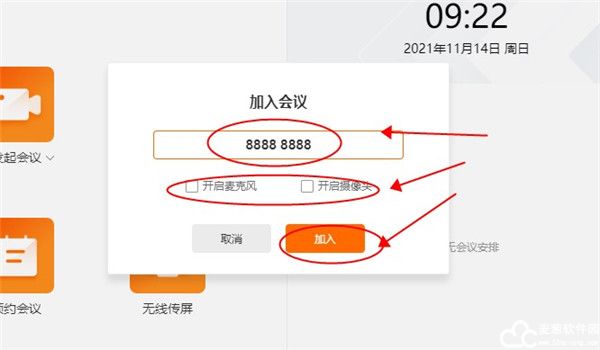 10、只需要输入想要加入会议的房间号即可加入,并且还能够设置麦克风以及摄像头。