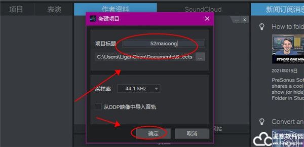 2、给这个新项目创建一个好听的标题以及保存路径,然后再设置采样率。