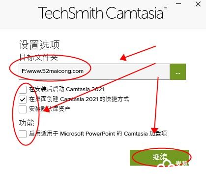 5、更改软件的目标文件夹的安装路径,再勾选需要的设置,点击继续。