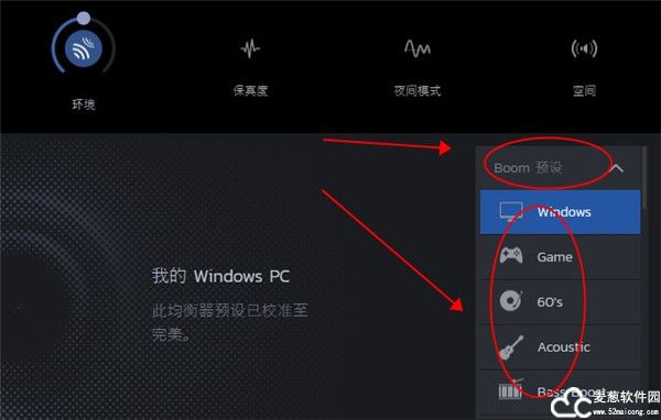 4、点击BOOM预设选项,在下拉中有着不一样的设备,就比如电脑、游戏以及吉他等。