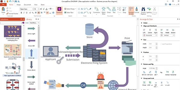 它提供了一套强大而全面的绘图工具,可以毫不费力地设计任何类型的定制模板来可视化特定的业务图纸,使用侧面板排列和格式化任何复杂的图表格式、顺序、对齐和位置工具,使您能够创建专业的外观流程图、流程图、工程图纸、信息图形、仪表板和更容易理解的图表。