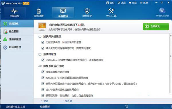 wise care 365,用户安装后就可以使用全部的功能,非常的方便,除此之外,还有很多的其他实用功能,就比如恢复文件、整理注册表等,可以最大限度解决文件之类的棘手问题。