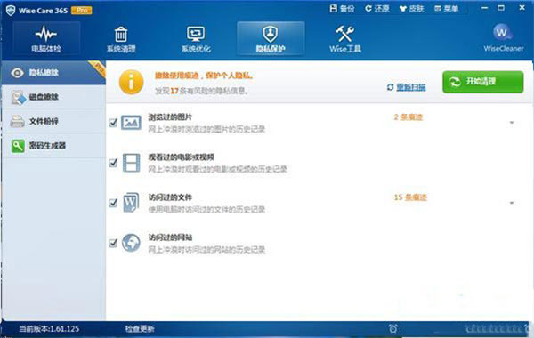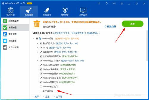 wise care 365破解版可以完成明细清除、基本清除、电子计算机清理痕迹、高級清除、系统瘦身。基本清很蠢,高級清除的高级设置可以让你加上大量不一样种类的系统垃圾文件后缀,让清除功能更强劲。系统瘦身可以删掉补丁包文档、实例歌曲和内置墙纸。