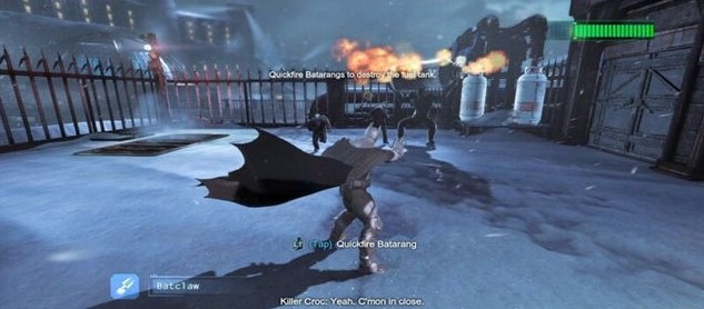 第二阶段:大概同一环节,可是跳完以后被抓的过程中会把相近钩爪的物品射到蝙蝠侠的胸口,会抓一个汽油桶砸到蝙蝠侠的身上。这儿必须留意的是,有别于平常作战中的还击,这一点不可以一直按,可是不会太难,了解一两次就行。