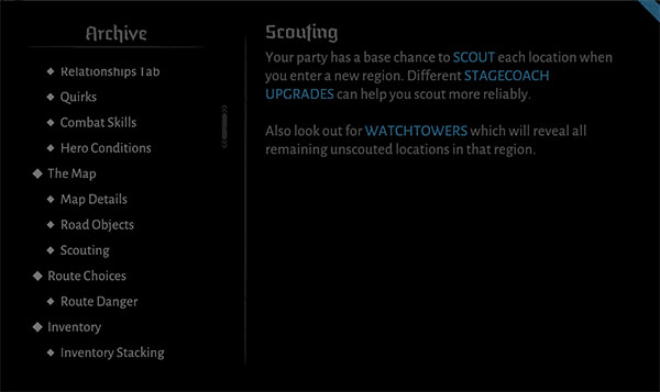 如果你进到一个地区时,你的精英团队对每一个地区都是有一个主要的侦查几率,不一样的牛车更新将产生一些或全部的侦查几率,这可以幫助你开展侦查。自然,你也能够在地图上寻找watchtowers(望塔)它将揭露该地域并未被侦查的全部土地资源