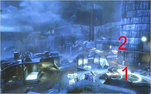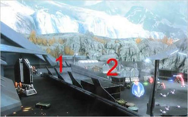 先把右侧小房子的对手清除整洁,随后在标识1处拿狙击步枪。阻击标识2和箭头符号处的狼兵,我们可以忽视下边的幽魂号,立即从箭头符号方位到标识2开启电源开关。随后返回基地。