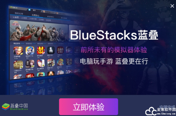 3、蓝叠模拟器安装完成,建议添加桌面图标生成快捷方式,方便在桌面上快速打开。然后我们点击“立即体验”。