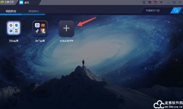 4、运行模拟器,点击“安装本地apk”,然后找到在麦葱站下载的软件包中解压的APK文件,双击打开就可以安装了。