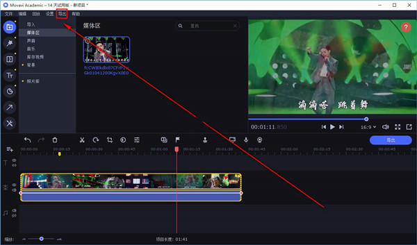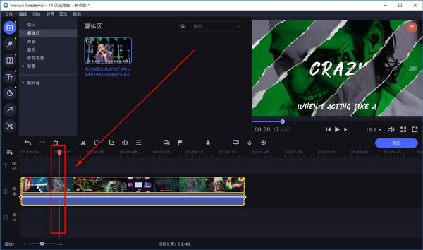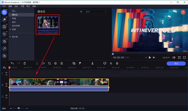 4、然后我们可以在软件中的媒体区查看到刚刚添加的文件,用鼠标点击文件不动,将文件添加到界面下方的时间轨道上。