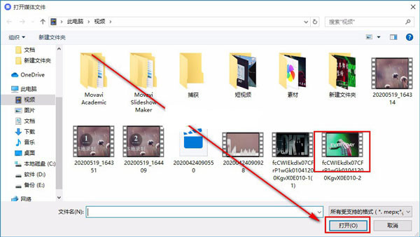 3、在本地文件夹中,找到自己的视频文件,再点击页面右下角的“打开”按钮即可成功将文件添加到软件中。